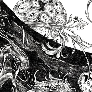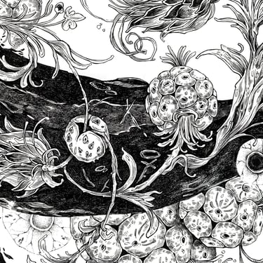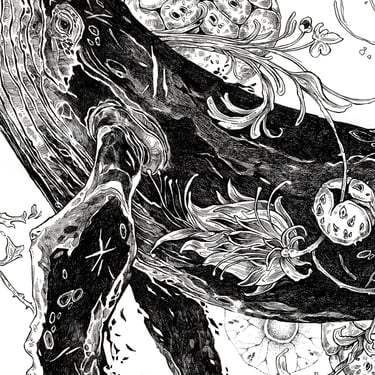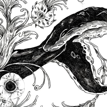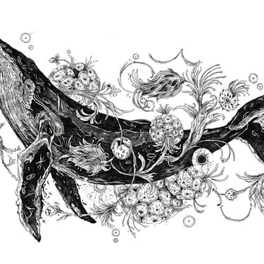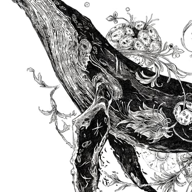 This work examines the relationship between natural form, movement, and space. The whale’s body is treated as a structural landscape, where organic elements emerge and disperse, suggesting breath, rhythm, and the quiet continuity of life within an open, suspended environment.